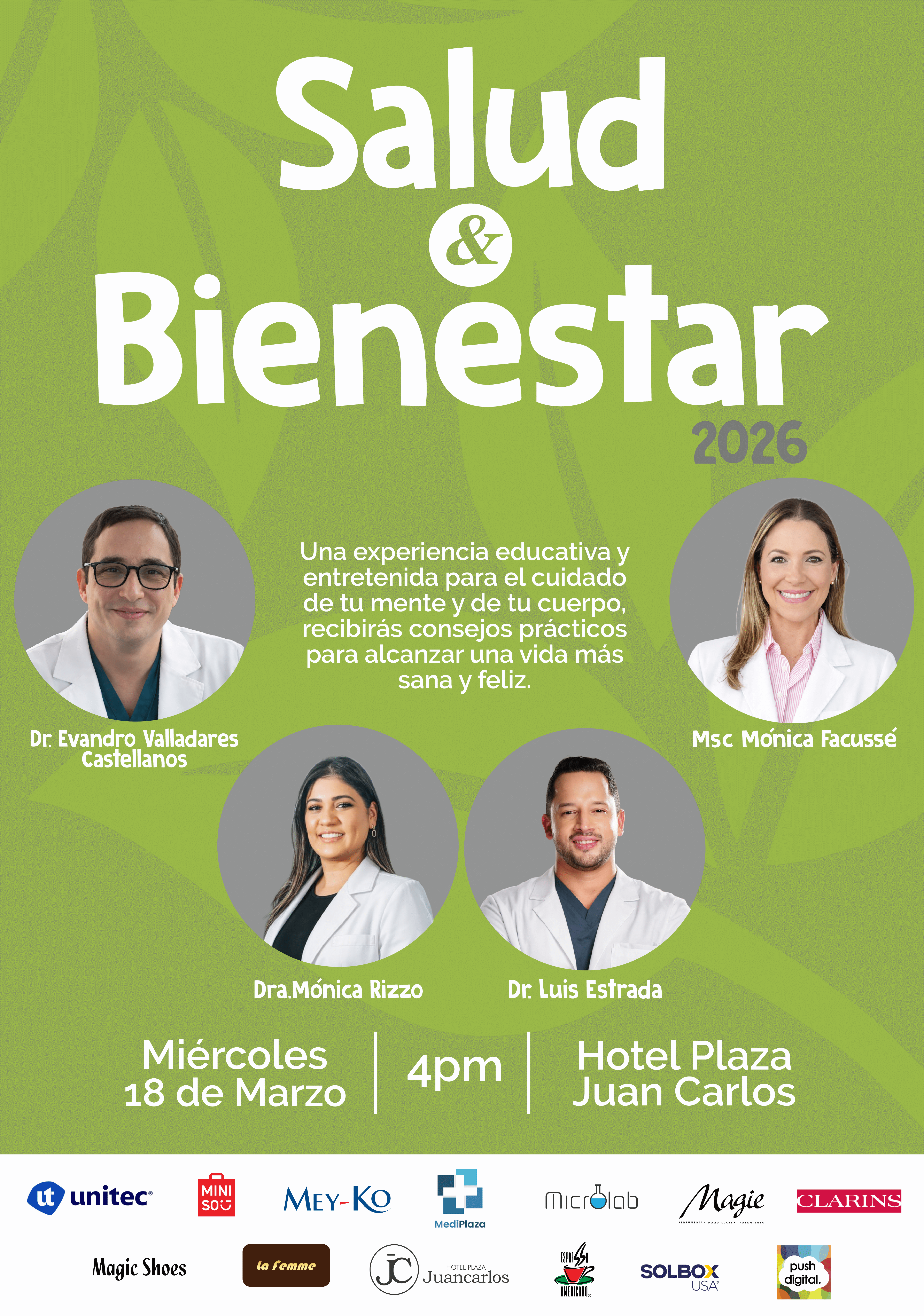 Te invitamos al evento Salud & Bienestar 2026, una experiencia educativa y entretenida donde aprenderás a cuidar tu mente y tu cuerpo con herramientas prácticas y consejos reales para alcanzar una vida más sana y feliz. Aprenderás de temas como salud mental, nutrición personalizada sostenible, el sueño y la recuperación, técnicas de bienestar, cuidado del corazón, diabetes entre otros.
